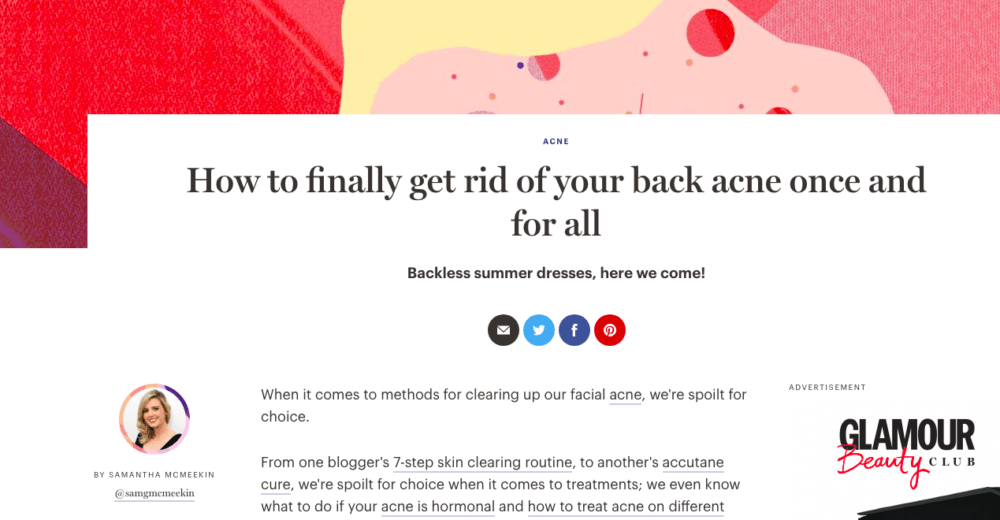 With sunny weather on the horizon for the upcoming bank holiday, off-the-shoulder tops and strappy dresses mean that it’s time to think about how to finally get rid of back acne or “bacne”. Some of my top pointers are listed below, but you can read my advice in Glamour by clicking here for the full
