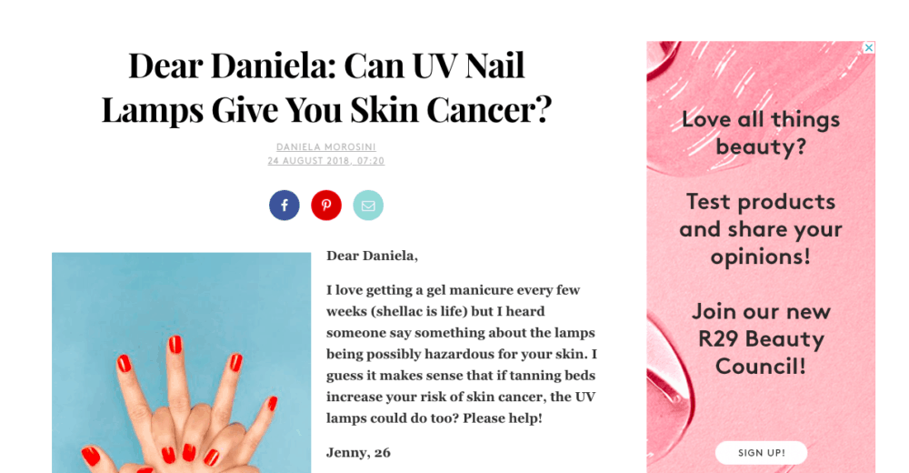 We know sunbeds and sunbathing are bad news when it comes to increasing our chances of developing skin cancer, but what about the UV lamps used for gel manicures? Daniela Morosini asked me this very question for her recent article in Refinery29 and it turns out the answer isn’t as simple as you might think.