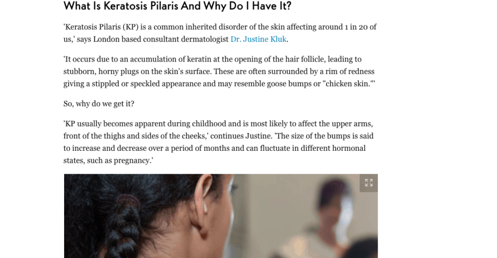 Keratosis Pilaris (KP) is a common inherited disorder of the skin affecting around 1 in 20 of us. It occurs due to an accumulation of keratin at the opening of the hair follicle, leading to stubborn, scaly plugs on the skin’s surface. These are often surrounded by a rim of redness giving a stippled